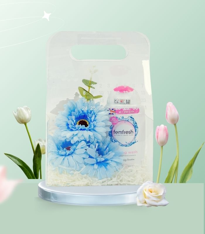 - Dung dịch vệ sinh Femfresh trong Combo Quà Tặng Yêu Thương giúp bạn vệ sinh vùng kín hằng ngày giúp làm sạch, khử mùi hôi, làm thơm vùng kín mang lại cảm giác khô thoáng.